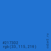 Цвет #2173D2 в цветовой модели RGB обозначается тремя октетами (33, 115, 210) в десятичном формате и #2173D2 в шестнадцатиричном (hex) формате, которые являются интенсивностью красного 33 (hex 21), интенсивность зелёного 115 (hex 73) и интенсивность синего 210 (hex D2).
