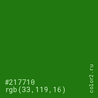 Цвет #217710 в цветовой модели RGB обозначается тремя октетами (33, 119, 16) в десятичном формате и #217710 в шестнадцатиричном (hex) формате, которые являются интенсивностью красного 33 (hex 21), интенсивность зелёного 119 (hex 77) и интенсивность синего 16 (hex 10).