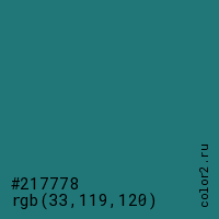 Цвет #217778 в цветовой модели RGB обозначается тремя октетами (33, 119, 120) в десятичном формате и #217778 в шестнадцатиричном (hex) формате, которые являются интенсивностью красного 33 (hex 21), интенсивность зелёного 119 (hex 77) и интенсивность синего 120 (hex 78).