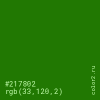 Цвет #217802 в цветовой модели RGB обозначается тремя октетами (33, 120, 2) в десятичном формате и #217802 в шестнадцатиричном (hex) формате, которые являются интенсивностью красного 33 (hex 21), интенсивность зелёного 120 (hex 78) и интенсивность синего 2 (hex 02).
