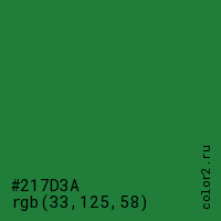 Цвет #217D3A в цветовой модели RGB обозначается тремя октетами (33, 125, 58) в десятичном формате и #217D3A в шестнадцатиричном (hex) формате, которые являются интенсивностью красного 33 (hex 21), интенсивность зелёного 125 (hex 7D) и интенсивность синего 58 (hex 3A).
