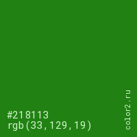 Цвет #218113 в цветовой модели RGB обозначается тремя октетами (33, 129, 19) в десятичном формате и #218113 в шестнадцатиричном (hex) формате, которые являются интенсивностью красного 33 (hex 21), интенсивность зелёного 129 (hex 81) и интенсивность синего 19 (hex 13).