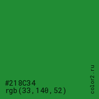 Цвет #218C34 в цветовой модели RGB обозначается тремя октетами (33, 140, 52) в десятичном формате и #218C34 в шестнадцатиричном (hex) формате, которые являются интенсивностью красного 33 (hex 21), интенсивность зелёного 140 (hex 8C) и интенсивность синего 52 (hex 34).