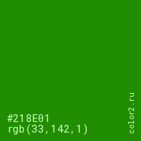 Цвет #218E01 в цветовой модели RGB обозначается тремя октетами (33, 142, 1) в десятичном формате и #218E01 в шестнадцатиричном (hex) формате, которые являются интенсивностью красного 33 (hex 21), интенсивность зелёного 142 (hex 8E) и интенсивность синего 1 (hex 01).