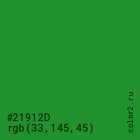 Цвет #21912D в цветовой модели RGB обозначается тремя октетами (33, 145, 45) в десятичном формате и #21912D в шестнадцатиричном (hex) формате, которые являются интенсивностью красного 33 (hex 21), интенсивность зелёного 145 (hex 91) и интенсивность синего 45 (hex 2D).