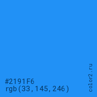 Цвет #2191F6 в цветовой модели RGB обозначается тремя октетами (33, 145, 246) в десятичном формате и #2191F6 в шестнадцатиричном (hex) формате, которые являются интенсивностью красного 33 (hex 21), интенсивность зелёного 145 (hex 91) и интенсивность синего 246 (hex F6).