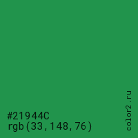 Цвет #21944C в цветовой модели RGB обозначается тремя октетами (33, 148, 76) в десятичном формате и #21944C в шестнадцатиричном (hex) формате, которые являются интенсивностью красного 33 (hex 21), интенсивность зелёного 148 (hex 94) и интенсивность синего 76 (hex 4C).