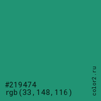 Цвет #219474 в цветовой модели RGB обозначается тремя октетами (33, 148, 116) в десятичном формате и #219474 в шестнадцатиричном (hex) формате, которые являются интенсивностью красного 33 (hex 21), интенсивность зелёного 148 (hex 94) и интенсивность синего 116 (hex 74).