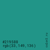 Цвет #219588 в цветовой модели RGB обозначается тремя октетами (33, 149, 136) в десятичном формате и #219588 в шестнадцатиричном (hex) формате, которые являются интенсивностью красного 33 (hex 21), интенсивность зелёного 149 (hex 95) и интенсивность синего 136 (hex 88).