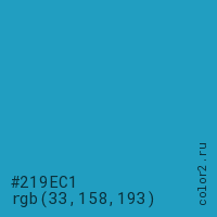 Цвет #219EC1 в цветовой модели RGB обозначается тремя октетами (33, 158, 193) в десятичном формате и #219EC1 в шестнадцатиричном (hex) формате, которые являются интенсивностью красного 33 (hex 21), интенсивность зелёного 158 (hex 9E) и интенсивность синего 193 (hex C1).