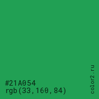 Цвет #21A054 в цветовой модели RGB обозначается тремя октетами (33, 160, 84) в десятичном формате и #21A054 в шестнадцатиричном (hex) формате, которые являются интенсивностью красного 33 (hex 21), интенсивность зелёного 160 (hex A0) и интенсивность синего 84 (hex 54).