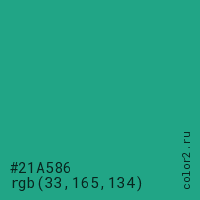 Цвет #21A586 в цветовой модели RGB обозначается тремя октетами (33, 165, 134) в десятичном формате и #21A586 в шестнадцатиричном (hex) формате, которые являются интенсивностью красного 33 (hex 21), интенсивность зелёного 165 (hex A5) и интенсивность синего 134 (hex 86).
