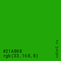 Цвет #21A808 в цветовой модели RGB обозначается тремя октетами (33, 168, 8) в десятичном формате и #21A808 в шестнадцатиричном (hex) формате, которые являются интенсивностью красного 33 (hex 21), интенсивность зелёного 168 (hex A8) и интенсивность синего 8 (hex 08).