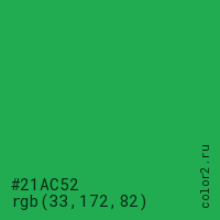 Цвет #21AC52 в цветовой модели RGB обозначается тремя октетами (33, 172, 82) в десятичном формате и #21AC52 в шестнадцатиричном (hex) формате, которые являются интенсивностью красного 33 (hex 21), интенсивность зелёного 172 (hex AC) и интенсивность синего 82 (hex 52).