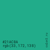 Цвет #21AC8A в цветовой модели RGB обозначается тремя октетами (33, 172, 138) в десятичном формате и #21AC8A в шестнадцатиричном (hex) формате, которые являются интенсивностью красного 33 (hex 21), интенсивность зелёного 172 (hex AC) и интенсивность синего 138 (hex 8A).