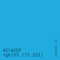 Цвет #21ACDF в цветовой модели RGB обозначается тремя октетами (33, 172, 223) в десятичном формате и #21ACDF в шестнадцатиричном (hex) формате, которые являются интенсивностью красного 33 (hex 21), интенсивность зелёного 172 (hex AC) и интенсивность синего 223 (hex DF).