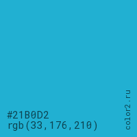 Цвет #21B0D2 в цветовой модели RGB обозначается тремя октетами (33, 176, 210) в десятичном формате и #21B0D2 в шестнадцатиричном (hex) формате, которые являются интенсивностью красного 33 (hex 21), интенсивность зелёного 176 (hex B0) и интенсивность синего 210 (hex D2).