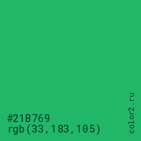 Цвет #21B769 в цветовой модели RGB обозначается тремя октетами (33, 183, 105) в десятичном формате и #21B769 в шестнадцатиричном (hex) формате, которые являются интенсивностью красного 33 (hex 21), интенсивность зелёного 183 (hex B7) и интенсивность синего 105 (hex 69).