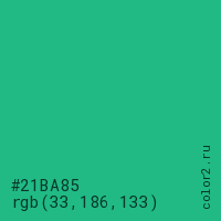 Цвет #21BA85 в цветовой модели RGB обозначается тремя октетами (33, 186, 133) в десятичном формате и #21BA85 в шестнадцатиричном (hex) формате, которые являются интенсивностью красного 33 (hex 21), интенсивность зелёного 186 (hex BA) и интенсивность синего 133 (hex 85).
