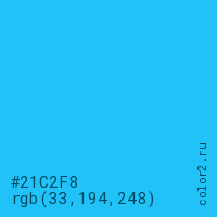 Цвет #21C2F8 в цветовой модели RGB обозначается тремя октетами (33, 194, 248) в десятичном формате и #21C2F8 в шестнадцатиричном (hex) формате, которые являются интенсивностью красного 33 (hex 21), интенсивность зелёного 194 (hex C2) и интенсивность синего 248 (hex F8).
