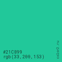 Цвет #21C899 в цветовой модели RGB обозначается тремя октетами (33, 200, 153) в десятичном формате и #21C899 в шестнадцатиричном (hex) формате, которые являются интенсивностью красного 33 (hex 21), интенсивность зелёного 200 (hex C8) и интенсивность синего 153 (hex 99).