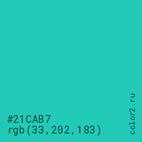 Цвет #21CAB7 в цветовой модели RGB обозначается тремя октетами (33, 202, 183) в десятичном формате и #21CAB7 в шестнадцатиричном (hex) формате, которые являются интенсивностью красного 33 (hex 21), интенсивность зелёного 202 (hex CA) и интенсивность синего 183 (hex B7).