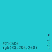 Цвет #21CAD0 в цветовой модели RGB обозначается тремя октетами (33, 202, 208) в десятичном формате и #21CAD0 в шестнадцатиричном (hex) формате, которые являются интенсивностью красного 33 (hex 21), интенсивность зелёного 202 (hex CA) и интенсивность синего 208 (hex D0).