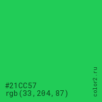 Цвет #21CC57 в цветовой модели RGB обозначается тремя октетами (33, 204, 87) в десятичном формате и #21CC57 в шестнадцатиричном (hex) формате, которые являются интенсивностью красного 33 (hex 21), интенсивность зелёного 204 (hex CC) и интенсивность синего 87 (hex 57).