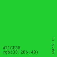 Цвет #21CE30 в цветовой модели RGB обозначается тремя октетами (33, 206, 48) в десятичном формате и #21CE30 в шестнадцатиричном (hex) формате, которые являются интенсивностью красного 33 (hex 21), интенсивность зелёного 206 (hex CE) и интенсивность синего 48 (hex 30).