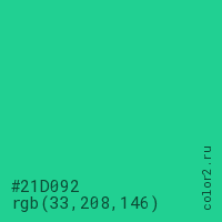 Цвет #21D092 в цветовой модели RGB обозначается тремя октетами (33, 208, 146) в десятичном формате и #21D092 в шестнадцатиричном (hex) формате, которые являются интенсивностью красного 33 (hex 21), интенсивность зелёного 208 (hex D0) и интенсивность синего 146 (hex 92).