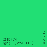 Цвет #21DF74 в цветовой модели RGB обозначается тремя октетами (33, 223, 116) в десятичном формате и #21DF74 в шестнадцатиричном (hex) формате, которые являются интенсивностью красного 33 (hex 21), интенсивность зелёного 223 (hex DF) и интенсивность синего 116 (hex 74).