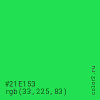 Цвет #21E153 в цветовой модели RGB обозначается тремя октетами (33, 225, 83) в десятичном формате и #21E153 в шестнадцатиричном (hex) формате, которые являются интенсивностью красного 33 (hex 21), интенсивность зелёного 225 (hex E1) и интенсивность синего 83 (hex 53).