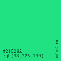 Цвет #21E282 в цветовой модели RGB обозначается тремя октетами (33, 226, 130) в десятичном формате и #21E282 в шестнадцатиричном (hex) формате, которые являются интенсивностью красного 33 (hex 21), интенсивность зелёного 226 (hex E2) и интенсивность синего 130 (hex 82).