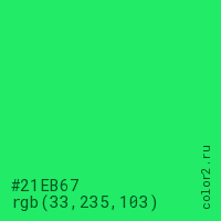 Цвет #21EB67 в цветовой модели RGB обозначается тремя октетами (33, 235, 103) в десятичном формате и #21EB67 в шестнадцатиричном (hex) формате, которые являются интенсивностью красного 33 (hex 21), интенсивность зелёного 235 (hex EB) и интенсивность синего 103 (hex 67).
