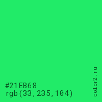 Цвет #21EB68 в цветовой модели RGB обозначается тремя октетами (33, 235, 104) в десятичном формате и #21EB68 в шестнадцатиричном (hex) формате, которые являются интенсивностью красного 33 (hex 21), интенсивность зелёного 235 (hex EB) и интенсивность синего 104 (hex 68).