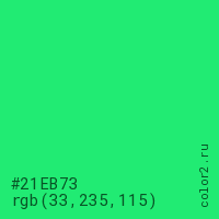 Цвет #21EB73 в цветовой модели RGB обозначается тремя октетами (33, 235, 115) в десятичном формате и #21EB73 в шестнадцатиричном (hex) формате, которые являются интенсивностью красного 33 (hex 21), интенсивность зелёного 235 (hex EB) и интенсивность синего 115 (hex 73).