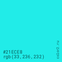 Цвет #21ECE8 в цветовой модели RGB обозначается тремя октетами (33, 236, 232) в десятичном формате и #21ECE8 в шестнадцатиричном (hex) формате, которые являются интенсивностью красного 33 (hex 21), интенсивность зелёного 236 (hex EC) и интенсивность синего 232 (hex E8).