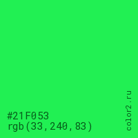 Цвет #21F053 в цветовой модели RGB обозначается тремя октетами (33, 240, 83) в десятичном формате и #21F053 в шестнадцатиричном (hex) формате, которые являются интенсивностью красного 33 (hex 21), интенсивность зелёного 240 (hex F0) и интенсивность синего 83 (hex 53).