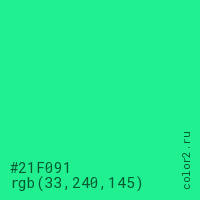 Цвет #21F091 в цветовой модели RGB обозначается тремя октетами (33, 240, 145) в десятичном формате и #21F091 в шестнадцатиричном (hex) формате, которые являются интенсивностью красного 33 (hex 21), интенсивность зелёного 240 (hex F0) и интенсивность синего 145 (hex 91).