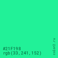Цвет #21F198 в цветовой модели RGB обозначается тремя октетами (33, 241, 152) в десятичном формате и #21F198 в шестнадцатиричном (hex) формате, которые являются интенсивностью красного 33 (hex 21), интенсивность зелёного 241 (hex F1) и интенсивность синего 152 (hex 98).