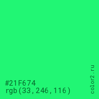 Цвет #21F674 в цветовой модели RGB обозначается тремя октетами (33, 246, 116) в десятичном формате и #21F674 в шестнадцатиричном (hex) формате, которые являются интенсивностью красного 33 (hex 21), интенсивность зелёного 246 (hex F6) и интенсивность синего 116 (hex 74).
