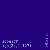 Цвет #22017F в цветовой модели RGB обозначается тремя октетами (34, 1, 127) в десятичном формате и #22017F в шестнадцатиричном (hex) формате, которые являются интенсивностью красного 34 (hex 22), интенсивность зелёного 1 (hex 01) и интенсивность синего 127 (hex 7F).