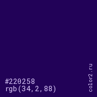Цвет #220258 в цветовой модели RGB обозначается тремя октетами (34, 2, 88) в десятичном формате и #220258 в шестнадцатиричном (hex) формате, которые являются интенсивностью красного 34 (hex 22), интенсивность зелёного 2 (hex 02) и интенсивность синего 88 (hex 58).