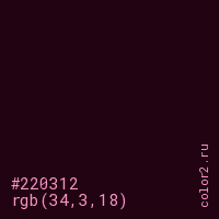 Цвет #220312 в цветовой модели RGB обозначается тремя октетами (34, 3, 18) в десятичном формате и #220312 в шестнадцатиричном (hex) формате, которые являются интенсивностью красного 34 (hex 22), интенсивность зелёного 3 (hex 03) и интенсивность синего 18 (hex 12).