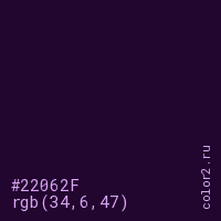 Цвет #22062F в цветовой модели RGB обозначается тремя октетами (34, 6, 47) в десятичном формате и #22062F в шестнадцатиричном (hex) формате, которые являются интенсивностью красного 34 (hex 22), интенсивность зелёного 6 (hex 06) и интенсивность синего 47 (hex 2F).