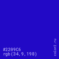 Цвет #2209C6 в цветовой модели RGB обозначается тремя октетами (34, 9, 198) в десятичном формате и #2209C6 в шестнадцатиричном (hex) формате, которые являются интенсивностью красного 34 (hex 22), интенсивность зелёного 9 (hex 09) и интенсивность синего 198 (hex C6).