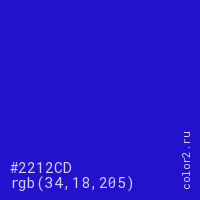 Цвет #2212CD в цветовой модели RGB обозначается тремя октетами (34, 18, 205) в десятичном формате и #2212CD в шестнадцатиричном (hex) формате, которые являются интенсивностью красного 34 (hex 22), интенсивность зелёного 18 (hex 12) и интенсивность синего 205 (hex CD).