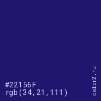 Цвет #22156F в цветовой модели RGB обозначается тремя октетами (34, 21, 111) в десятичном формате и #22156F в шестнадцатиричном (hex) формате, которые являются интенсивностью красного 34 (hex 22), интенсивность зелёного 21 (hex 15) и интенсивность синего 111 (hex 6F).
