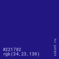 Цвет #221782 в цветовой модели RGB обозначается тремя октетами (34, 23, 130) в десятичном формате и #221782 в шестнадцатиричном (hex) формате, которые являются интенсивностью красного 34 (hex 22), интенсивность зелёного 23 (hex 17) и интенсивность синего 130 (hex 82).
