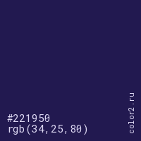 Цвет #221950 в цветовой модели RGB обозначается тремя октетами (34, 25, 80) в десятичном формате и #221950 в шестнадцатиричном (hex) формате, которые являются интенсивностью красного 34 (hex 22), интенсивность зелёного 25 (hex 19) и интенсивность синего 80 (hex 50).
